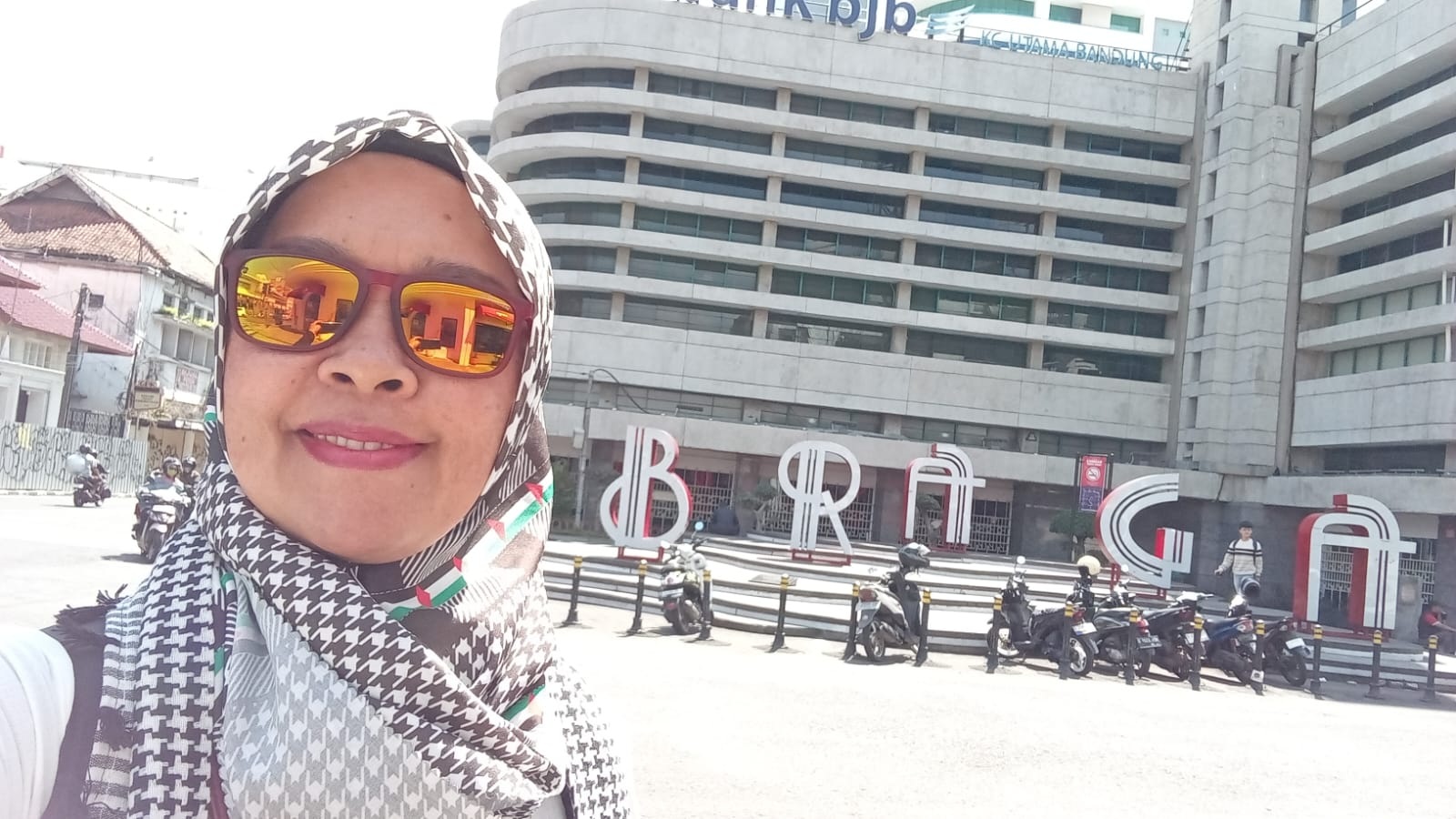 Diseberang kanan ada Sarinah bedekatan dengan Bank Pembangunan Daerah Jawa Barat dan Banten atau Bank BJB. Tulisan Braga dengan huruf sebesar orang dewasa dan berjarak warna putih dipadukan warna merah disetiap sisinya menambah indah saat kita berfoto.