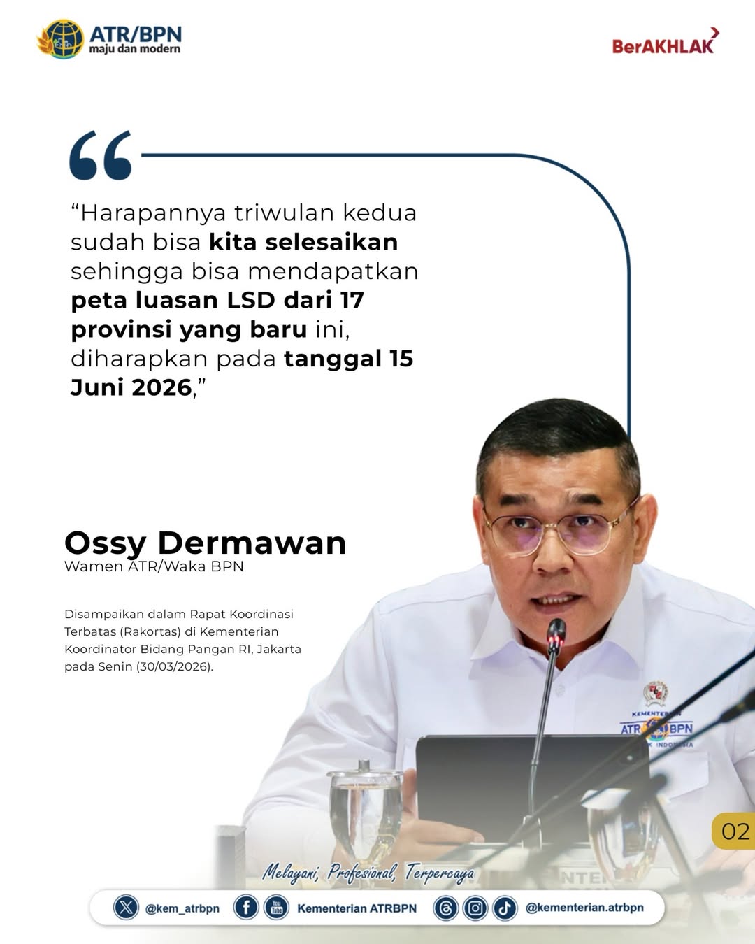 Wakil Menteri ATR/Wakil Kepala BPN, Ossy Dermawan, menyampaikan bahwa setelah penetapan LSD di 12 provinsi, pemerintah kini menargetkan penyusunan peta luasan LSD di 17 provinsi lainnya dapat diselesaikan pada kuartal II tahun 2026, dengan target pertengahan Juni.